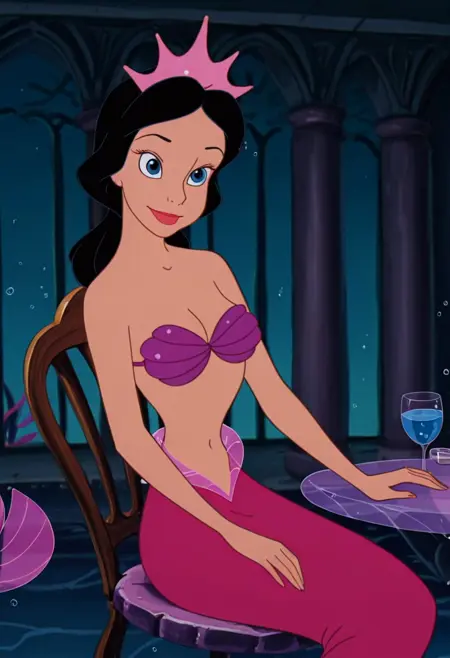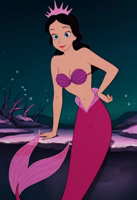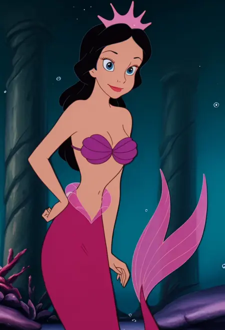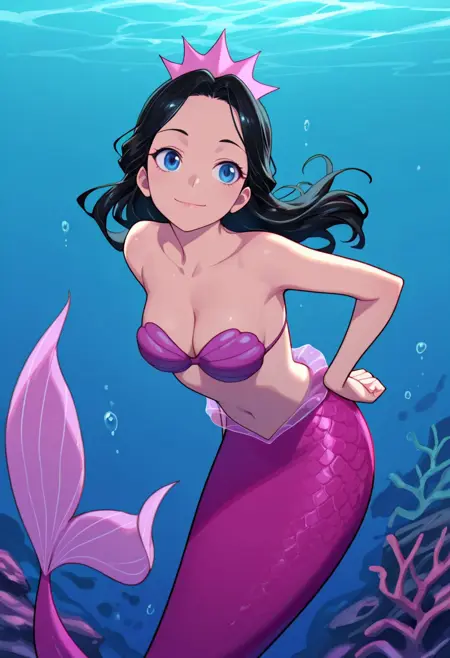 Appearance: black hair, long hair, blue eyes, crown, medium breasts, monster girl, mermaid, magenta tail, scales