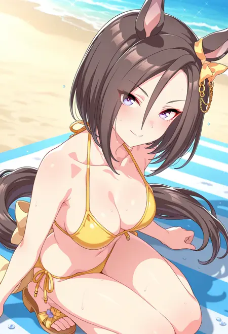 air_groove_nekoforge, 1girl, purple eyes, blue eyes, brown hair, short hair, hair between eyes, horse ears, animal ears, horse tail, ear bow, yellow bow, ear ornament, back bow, medium breasts, air groove (umamusume)