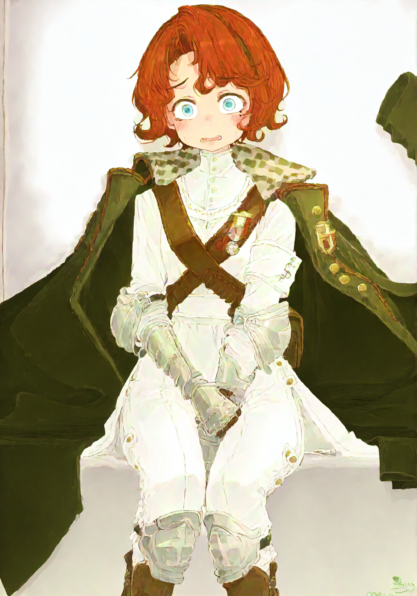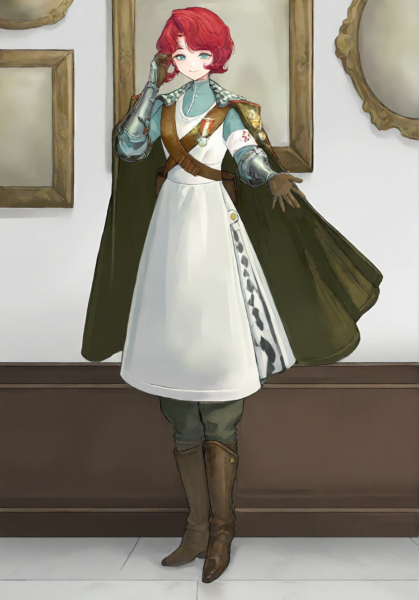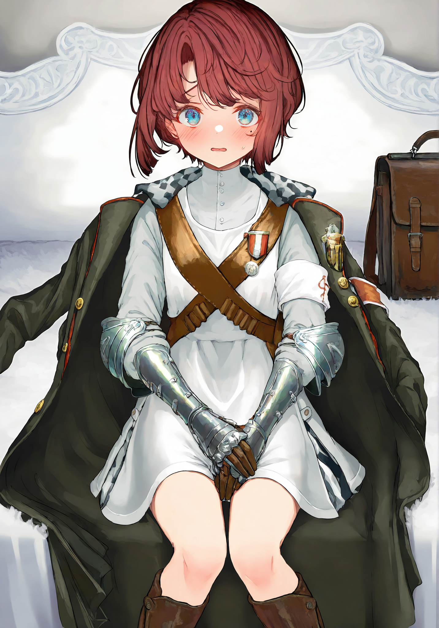 gloves,pants,brown footwear,badge,armband,brown bag,coat,long sleeves,dress,arm_guards,gauntlets,shoulder_belt