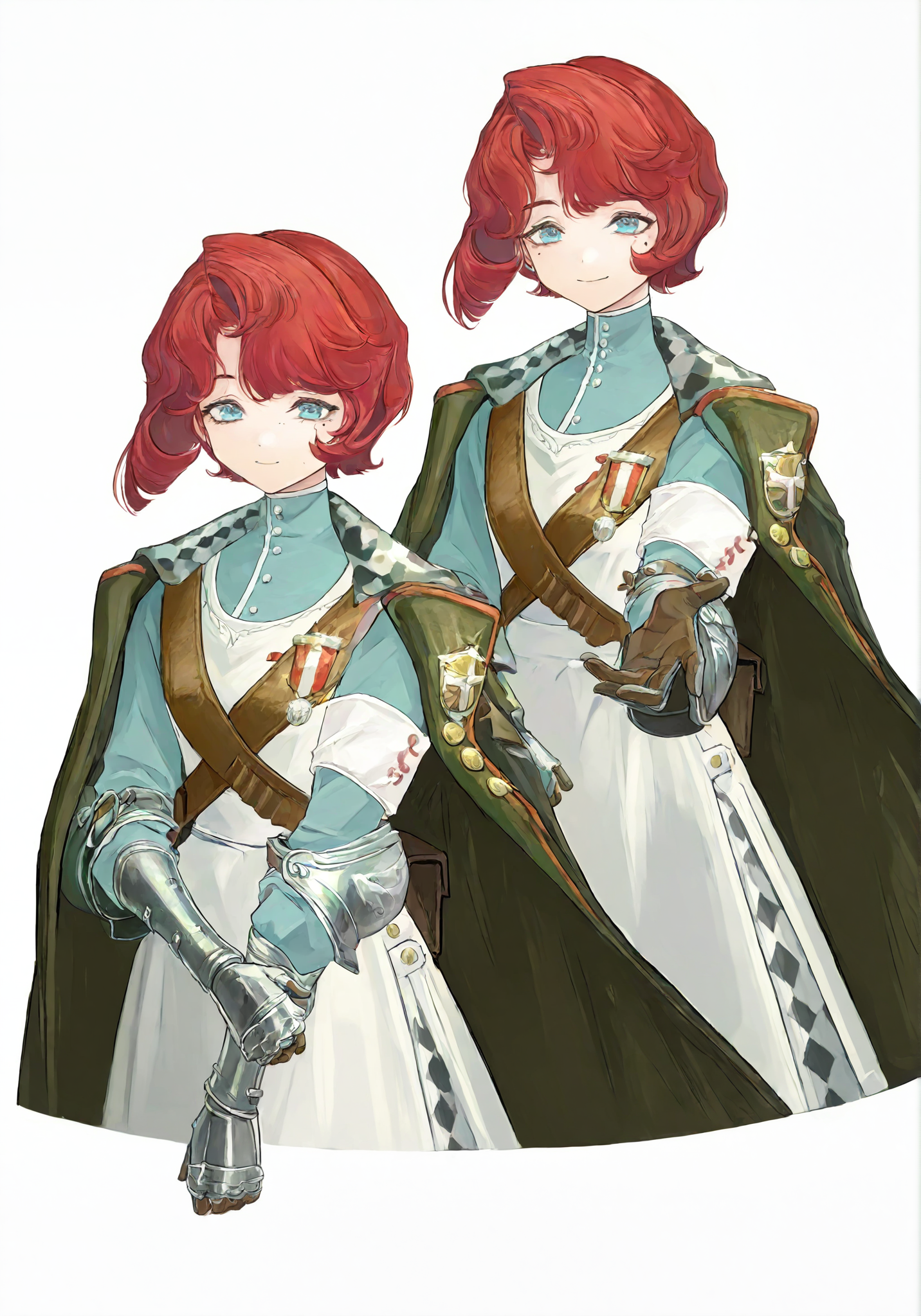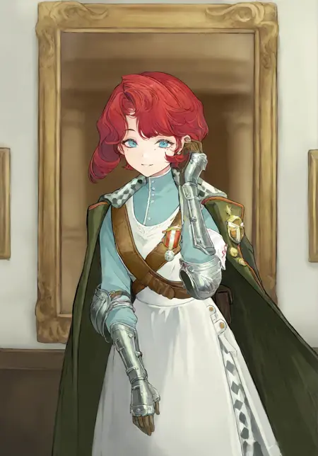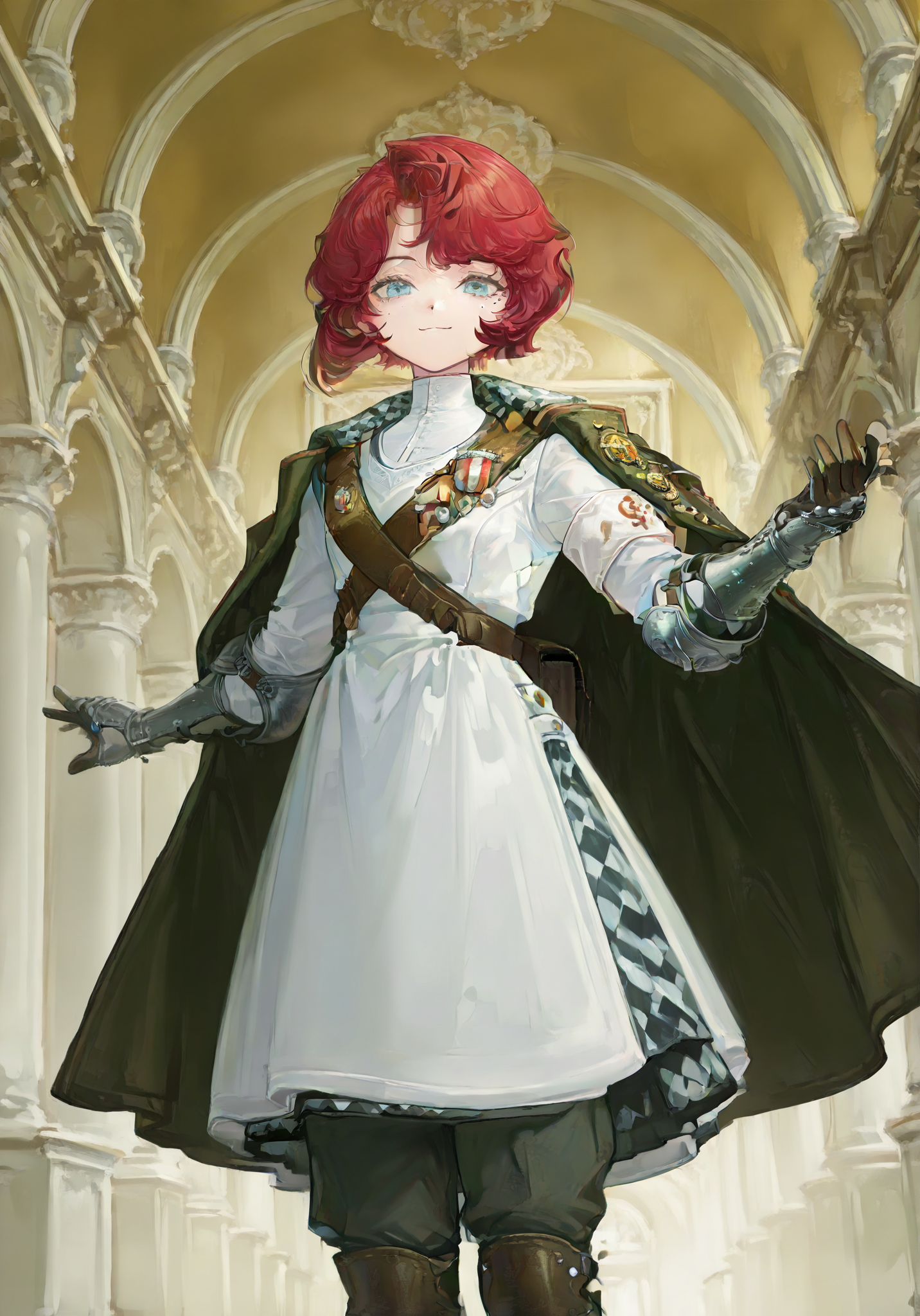 gloves,pants,brown footwear,badge,armband,brown bag,coat,long sleeves,dress,arm_guards,gauntlets,shoulder_belt