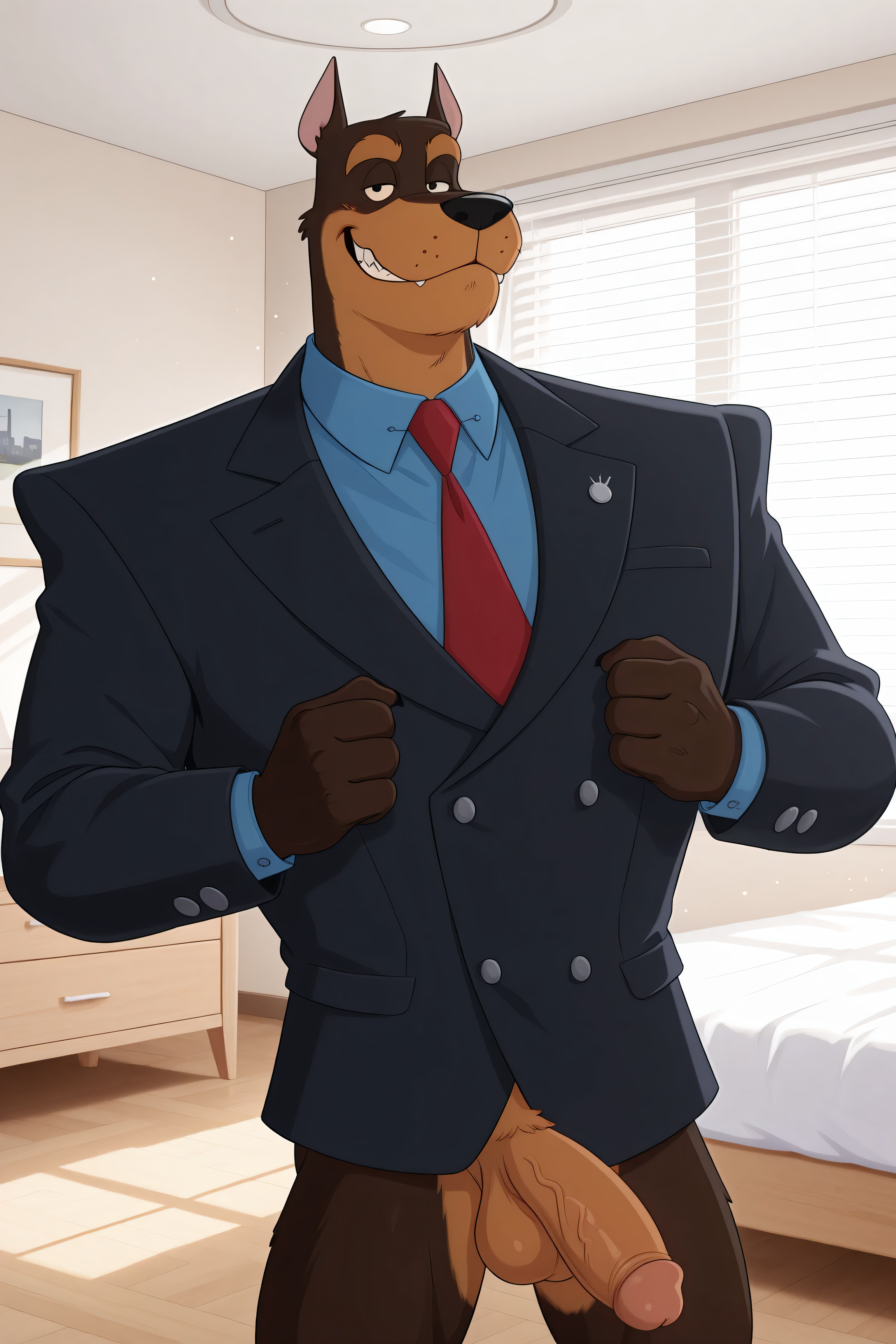 日常装扮——深黑色西装,蓝色衬衫,深黑色裤子拉下,红色领带,红色鞋子