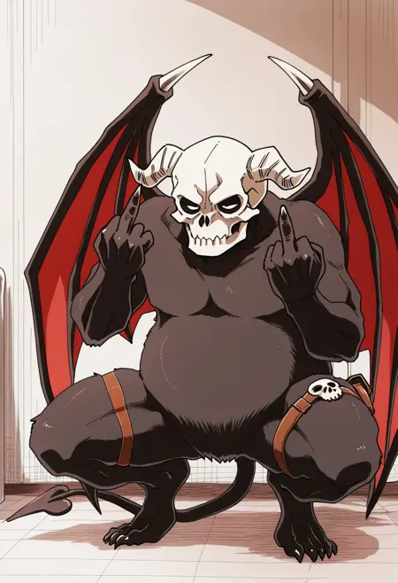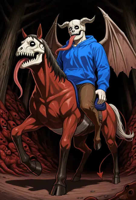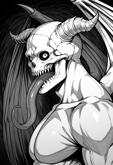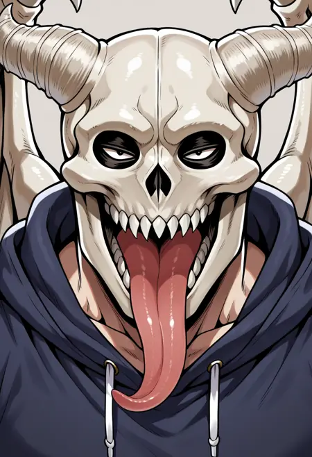 skull head, long tongue, muscular male, pale skin, brown legs, brown hooves, satyr