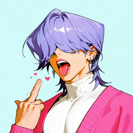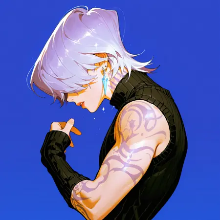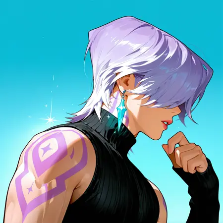 <lora:MYSTERY_SAJA:1> mystery_saja, short hair, 1boy, male focus, hair over eyes, jewelry, earrings, solo, upper body, shirt, covered eyes, grey hair, closed mouth, purple hair, sleeveless, sweater, simple background, turtleneck, blurry, open mouth, portrait, realistic, facing viewer, blurry background