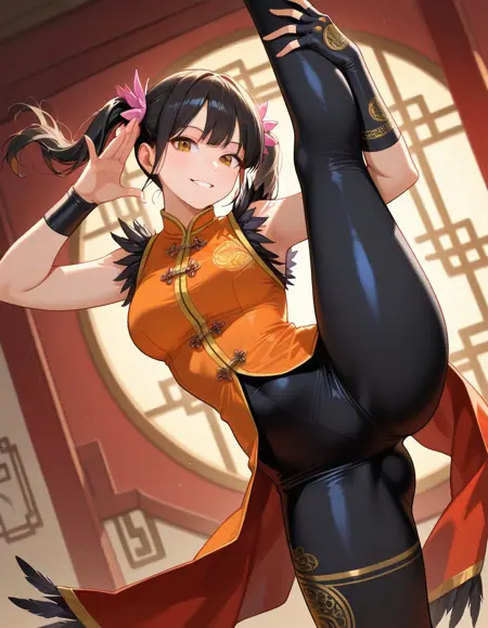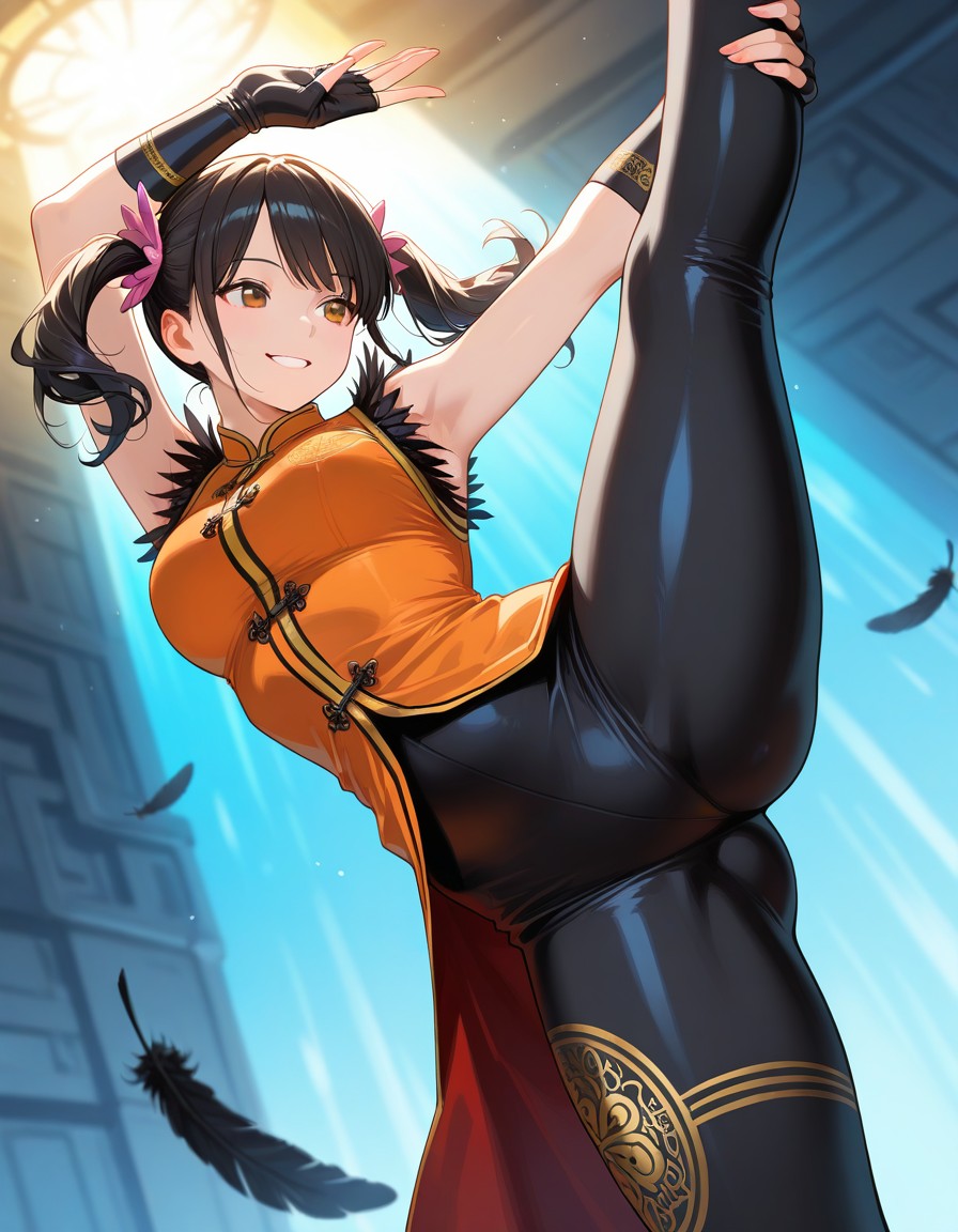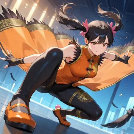 LingT7, black hair,twintails, black leggings, chinese dress, orange dress, black feather epaulettes, sleeveless, orange shoes, black wristband, black forearm glove, fingerless glove,