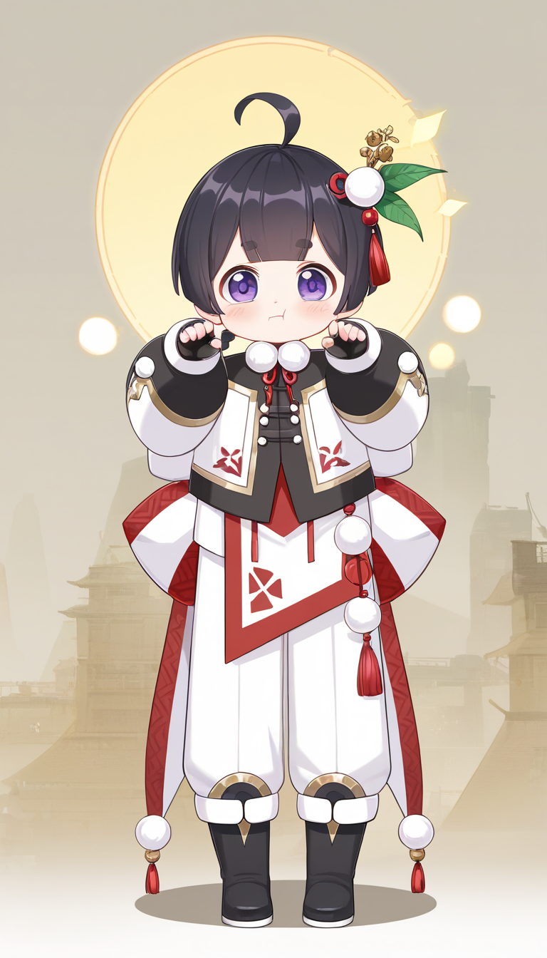 yuanxiao,1boy,black hair,purple eyes,ahoge,single braid,hair ornament,yellow flowers,red tassel,white jacket,layered clothing,gold trim,puffy sleeves,decorative patterns,white pants,gold accents,black fingerless gloves,solo,full body,bangs,tassel,pom pom (clothes),smile,male focus,looking at viewer,