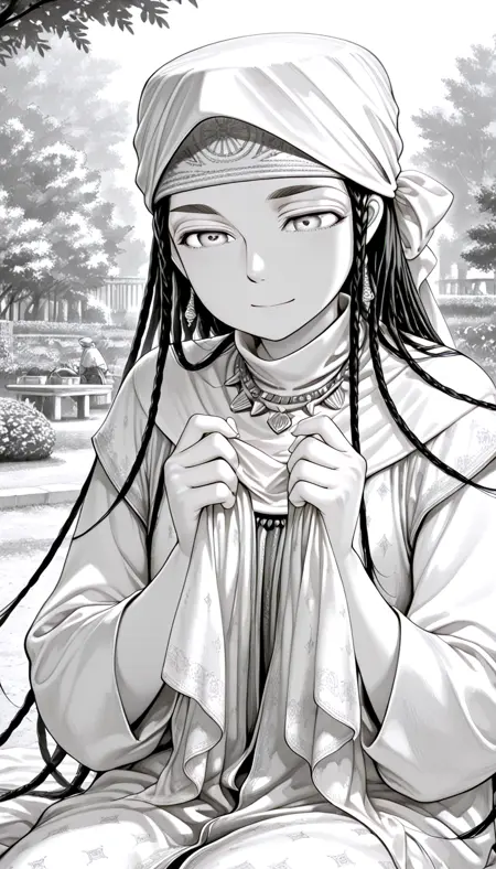稳定词:dark gray eyes, Brown jacket, ((Turban))