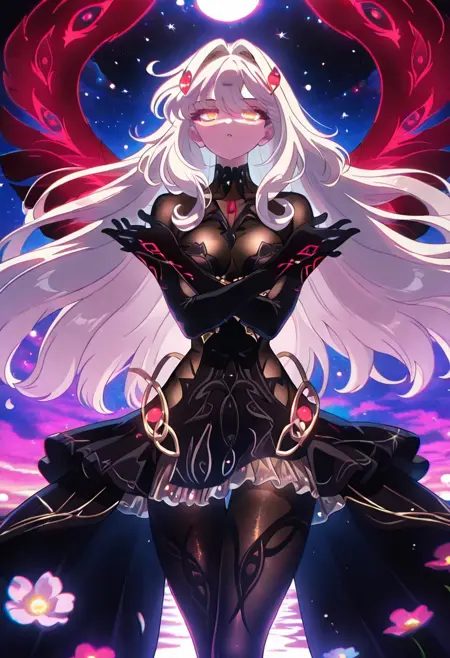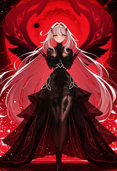 RonovaGI,1个女孩,单独,丰满身材,白皙皮肤,白发,长发,发夹,刘海,浓密头发,金色眼睛,花朵状瞳孔,粉红色嘴唇,黑色透明紧身衣,黑色无肩带连衣裙,大乳房,前开式裙子,粗大腿,褶皱灰色透明裙子,黑色羽毛,黑色歌剧手套,黑色高跟鞋,深红色翅膀带有眼睛形状的孔洞,黑色透明连裤袜,头发装饰