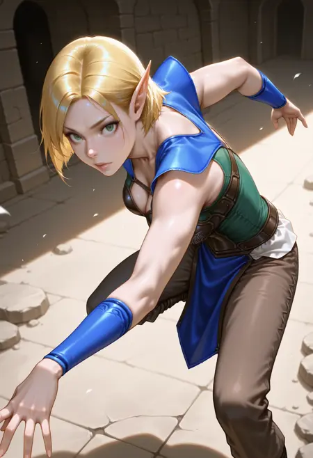 elf, pointy ears, green eyes, short hair, blonde hair, leather armor, green undershirt, sleeveless, blue shoulder pads, blue bracers, brown pants