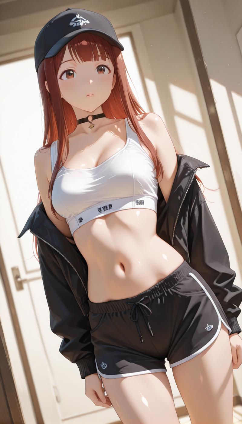 長袖、帽子、へそ、胸元、裸の肩、ジャケット、鎖骨、太もも、開いた衣装、ショートパンツ、ノースリーブ、チョーカー、お腹、腹部、オフショルダー、開いたジャケット、黒いジャケット、クロップドトップ、黒い帽子、短いショートパンツ、黒いチョーカー、黒いショートパンツ、ベースボールキャップ、Oリング、クロップドジャケット、ジッパー、スポーツブラ、ジッパーの引き輪、部分的に開いたジッパー、ドルフィンショート、白いスポーツブラ、Oリングチョーカー、シャツ、白いシャツ、ノースリーブシャツ、タンクトップ、白いタンクトップ