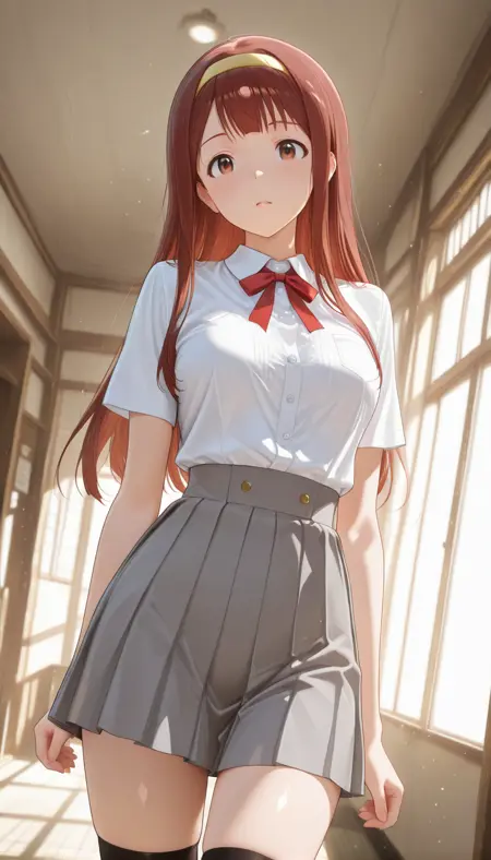 シャツ、スカート、タイツ、リボン、学ラン、白いシャツ、短い袖、太もも、プリーツスカート、ヘアバンド、襟付きシャツ、黒いタイツ、赤いリボン、絶対領域、ネックリボン、グレーのスカート、ハイウエストスカート、シャツをインする、黄色いヘアバンド、