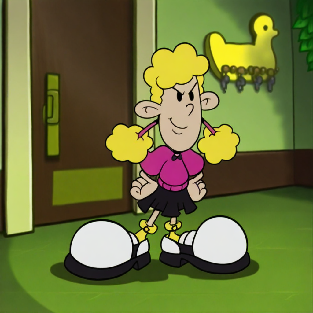 瓦莱里克,黑色眼睛,点状眼睛,卷曲的黄色头发,粉色毛衣,短袖毛衣,黑色裙子,白色大号鞋子,黄色袜子,卡通艺术风格,
