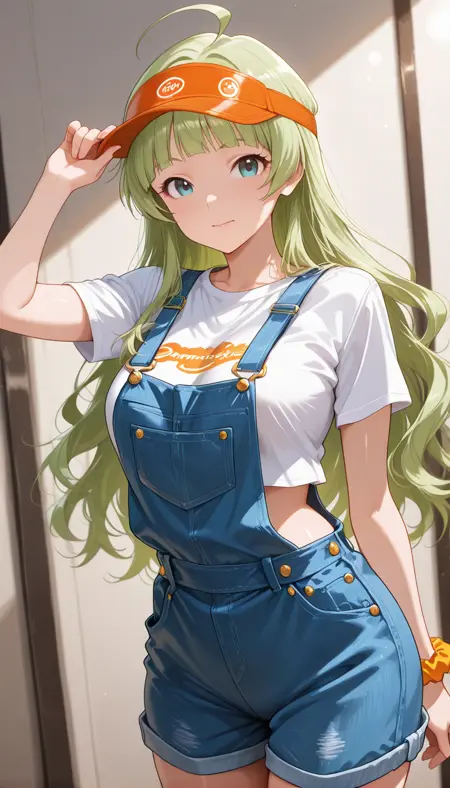 シャツ、帽子、ジュエリー、非常に長い髪、白いシャツ、ショートスリーブ、お腹、ブレスレット、クロップドトップ、スクンチー、デニム、Tシャツ、ビーサンキャップ、オーバーオール、手首のスクンチー、お腹の露出、クロップドシャツ、オレンジのヘアウェア、青いオーバーオール、オーバーオールショーツ、重ね着シャツ、