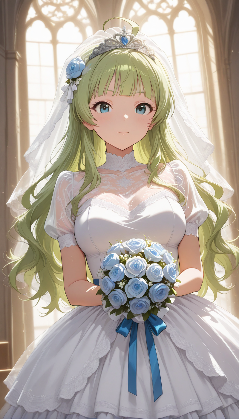 髪飾り、ドレス、花、ショートスリーブ、フリル、髪の花、白いドレス、透け感、薔薇、フリルドレス、ティアラ、ベール、ブーケ、ウェディングドレス、ブライダルベール、重ね着ドレス、透けスリーブ、花嫁、青い花、