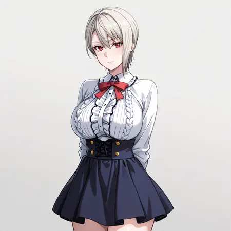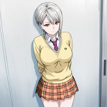 带校服毛衣的触发词:AliceNakiri, 1girl, 格子裙, 校服, 条纹领结, 红眼, 短发, 百褶裙, 灰发, 毛衣, 胸部, 衬衫, 牛仔构图