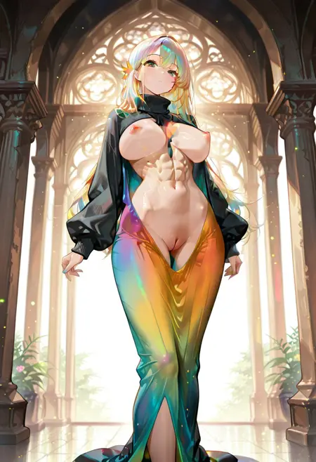 frontcutdress, exposed breasts, exposed nipples, exposed pussy, exposed abs