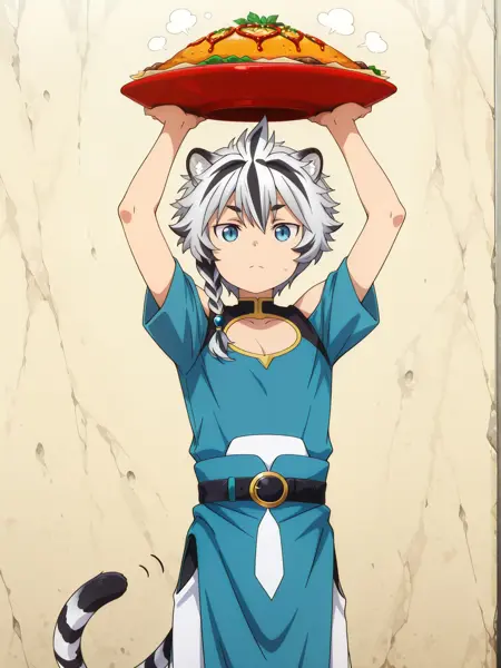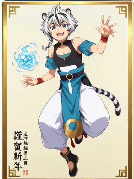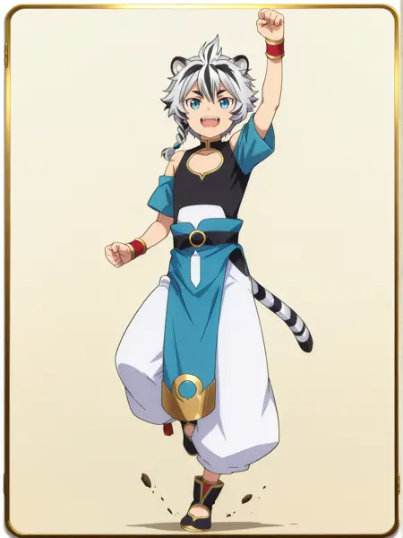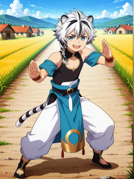 fohl fayon, white hair, black hair, braid, blue eyes, tiger tail, hair between eyes, streaked hair, two-toned hair, slit eyes, white tiger ears, sidelocks,