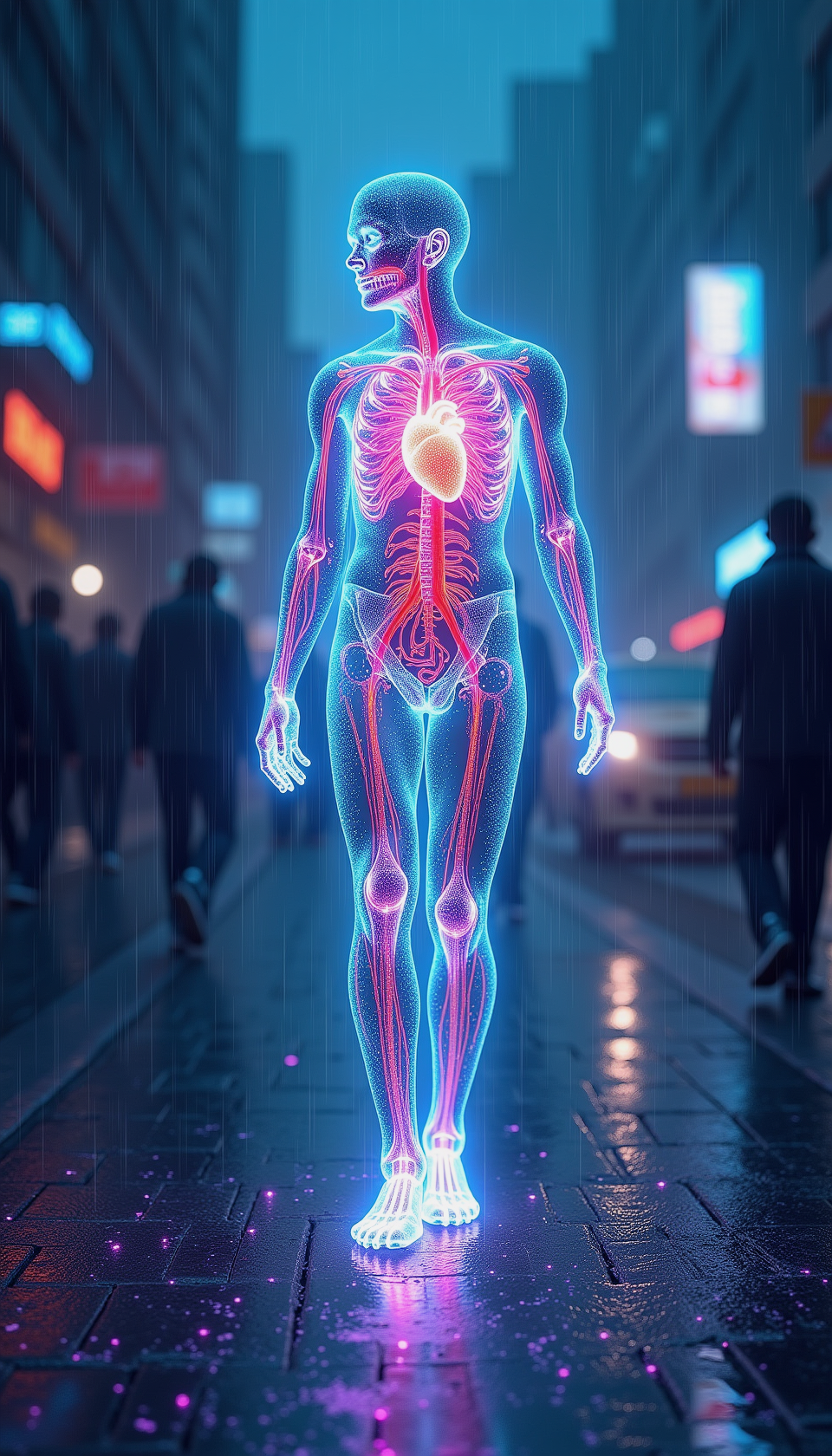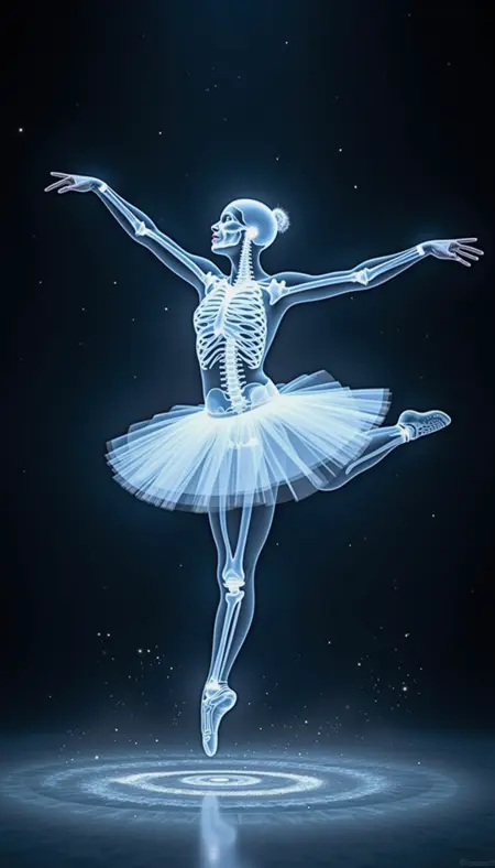 hologram-77 , 全息芭蕾舞者腾空跃起,透明纱裙下骨骼结构清晰可见,能量经络以动态光芒闪耀,布料呈现为粒子流并带有肥皂膜的虹彩效果,数字舞台在舞者脚下逐渐显现,体积光束照明,肌肉解剖结构以空灵叠加层精细呈现