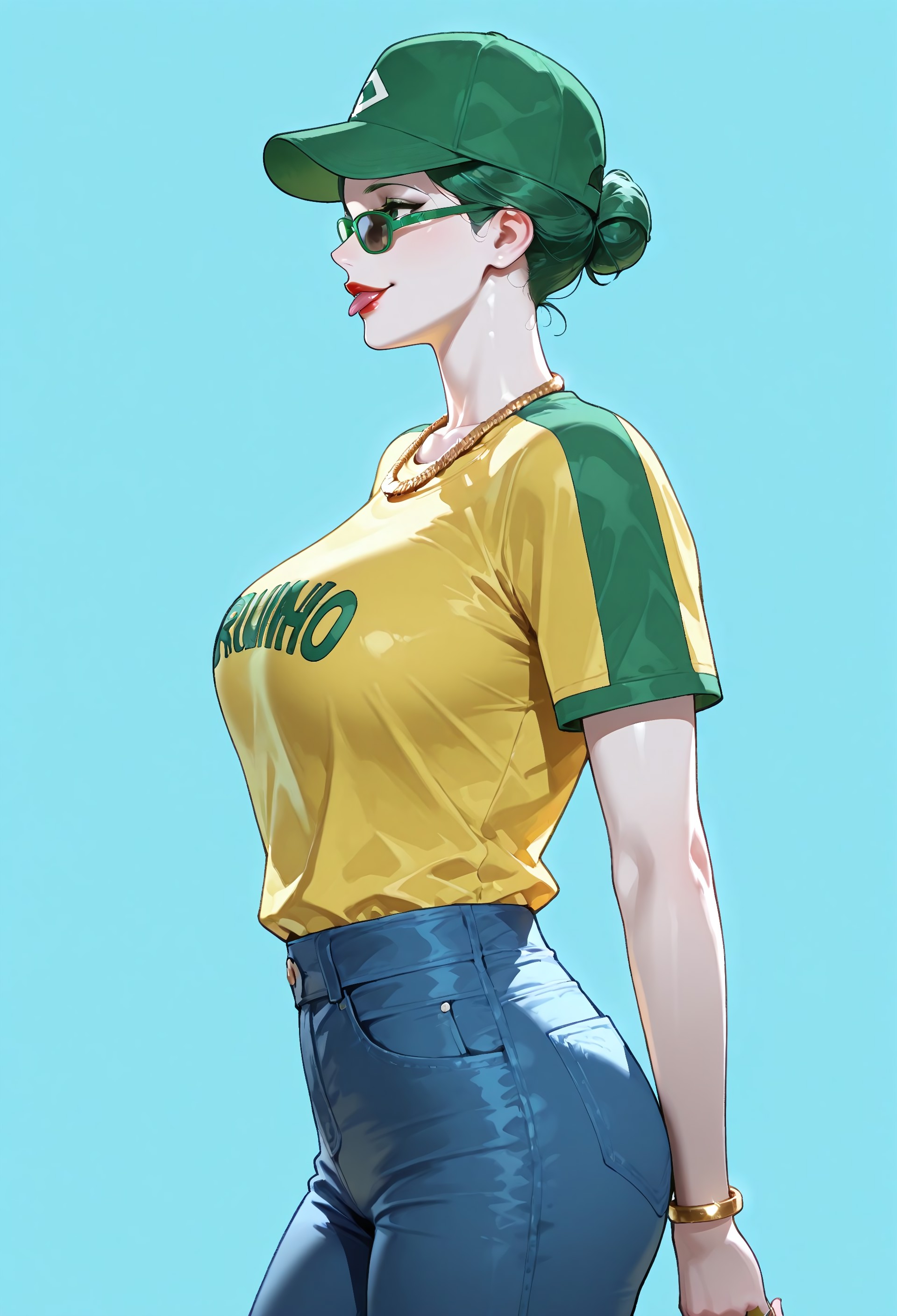 brun1nh0_0utf1t, 녹색 야구모자, 프린트 모자, 녹색 프레임 안경, 선글라스, 골드 체인 목걸이, 투톤 셔츠, 노란 셔츠, 녹색 셔츠, 티셔츠, 반소매, 옷에 글자 프린트, 브루니뉴, 골드 팔찌, 골드 반지, 청바지, 데님, 검정 플립플롭