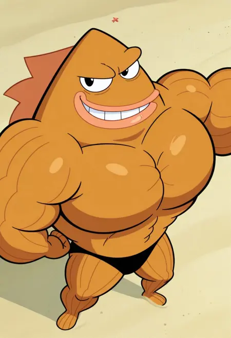 強化プロンプト: "anthro, 青銅色〜茶色の肌, 背鰭, 唇, 黒い目, 筋肉質, 男性的, 大きな胸筋"