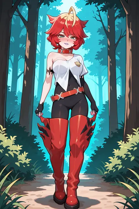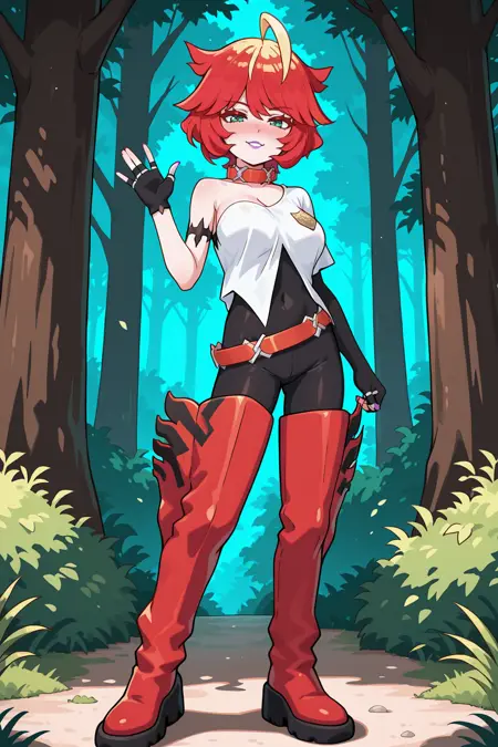 ➜ MelaPILXL, purple lips, red eyelashes, green eyes, red hair, blonde hair, multicolored hair, short hair, bangs, long ahoge, red choker, large breasts, sleeveless, single bare shoulder, white shirt, black bodysuit, single elbow gloves, black elbow gloves, fingerless gloves, red belt, red thigh boots