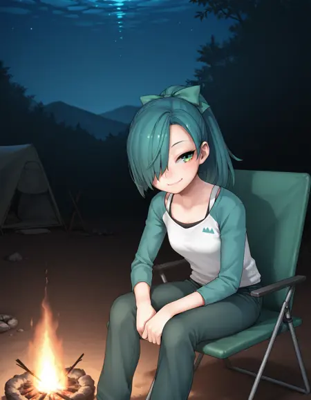 • 제이, 청록색 머리카락, 녹색 머리카락, 한쪽 눈을 가린 머리카락, 녹색 눈, 머리리본, 단발머리, 래글란 소매, 팬티스타킹