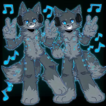 canine, wolf, furry, anthro, gray fur, light gray details, animal ears, wolf ears, blue eyes, headphones, tail, wolf tail, fluffy tail