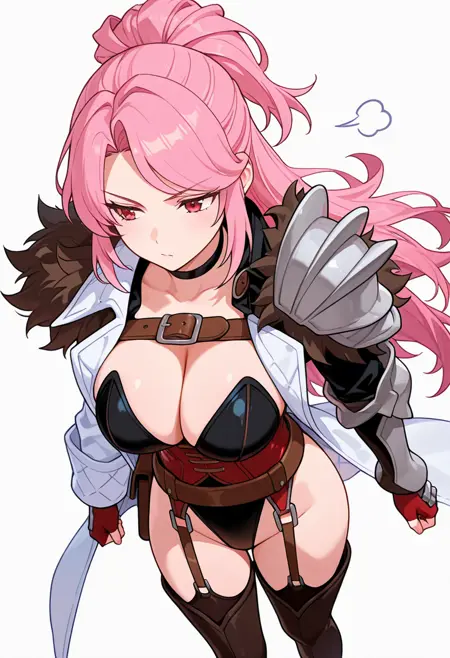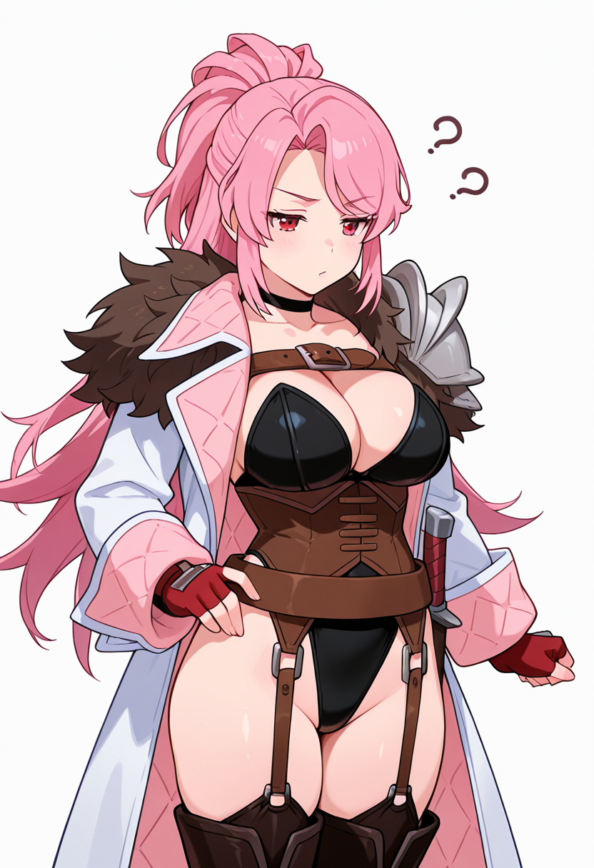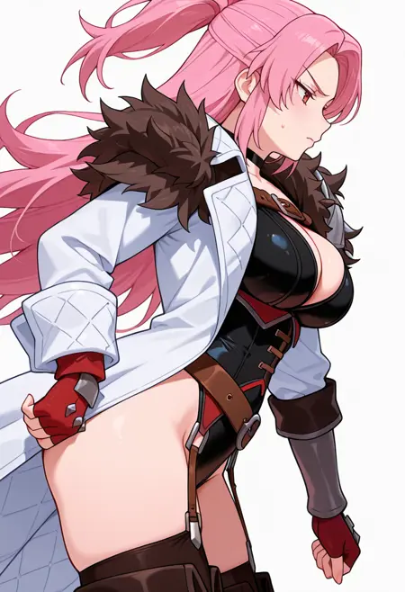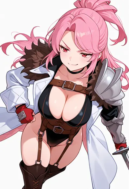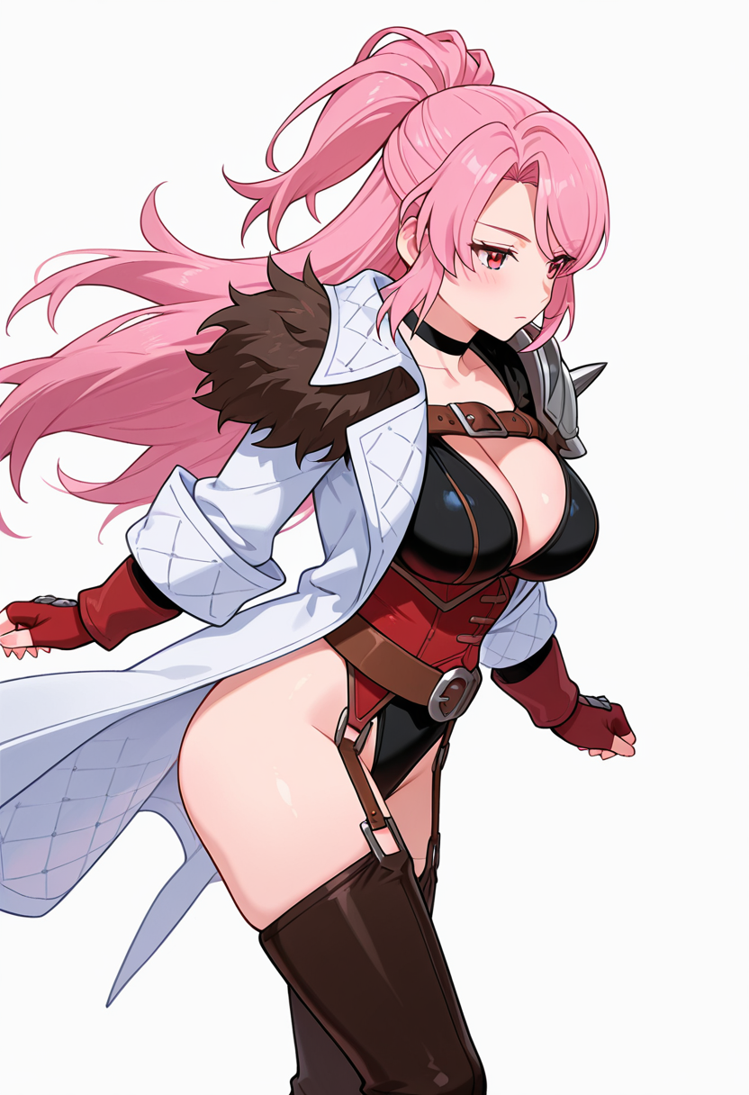 cleavage,shoulder armor,white coat, fur trim, black leotard, highleg leotard,red fingerless gloves, thigh boots, garter straps, black choker, belt, corset,