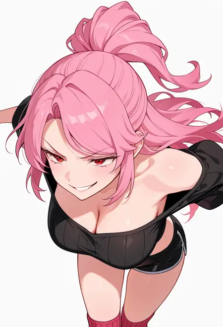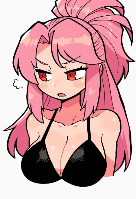 marona_cnr, 1girl, pink hair, long hair, ponytail, half updo, red eyes, large breasts,