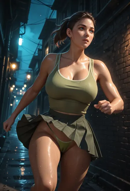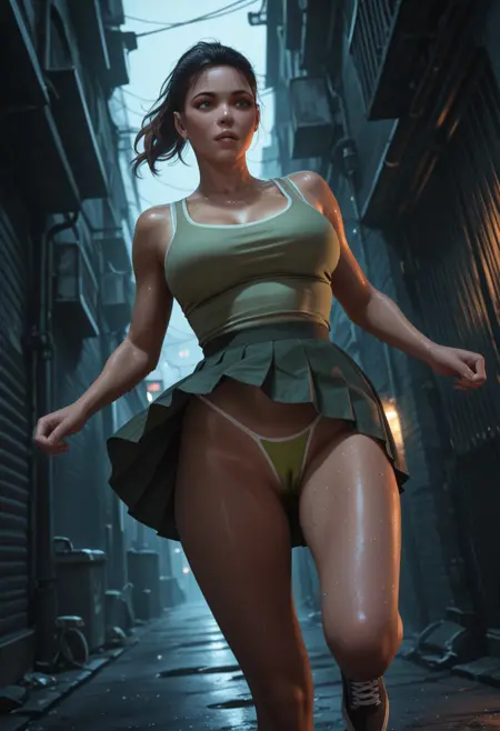 1girl, large breasts, ponytail, pixie hair, blue overall, cleavage,