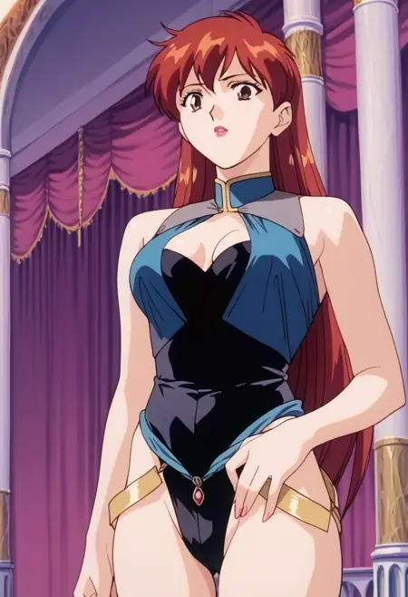 トリガー:juliana_m、ロングヘア、赤髪の女性、胸、レオタード、リップ、胸元の切り替え、肩出し