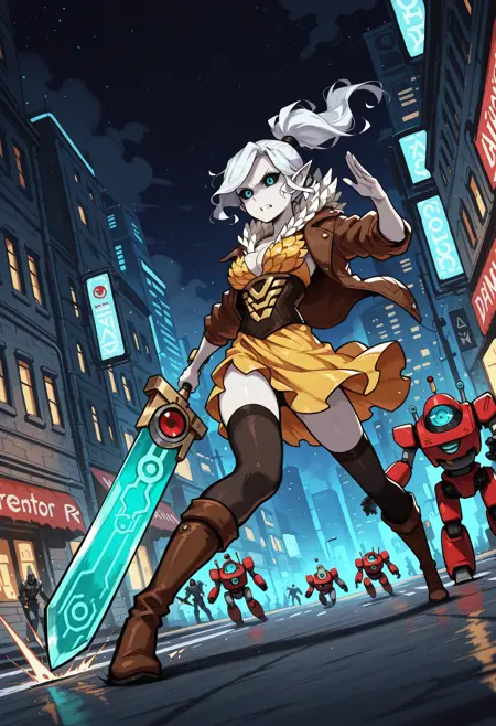 服装:黄色连衣裙、羽毛领连衣裙、黑色腰带、夹克、棕色夹克、黑色过膝袜、靴子,