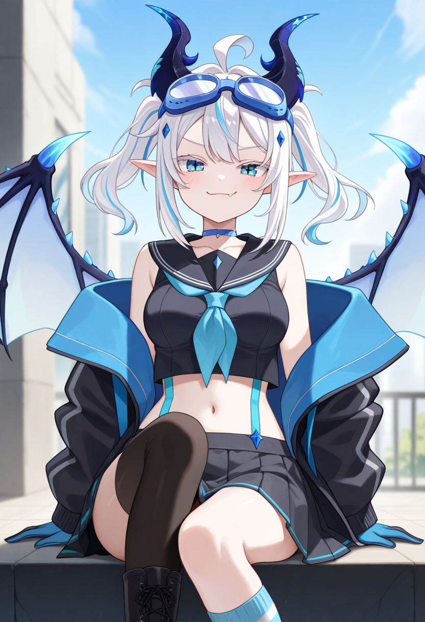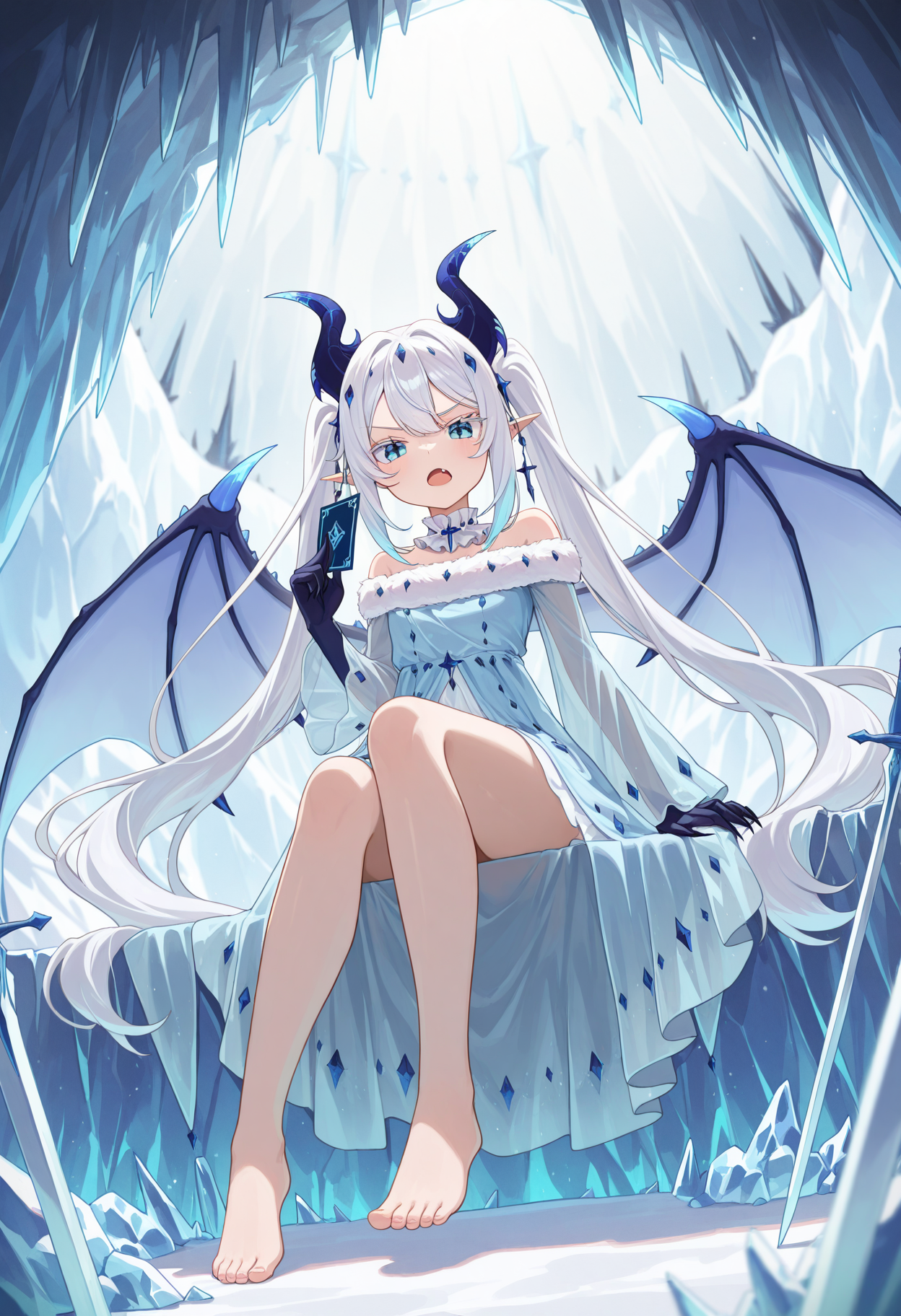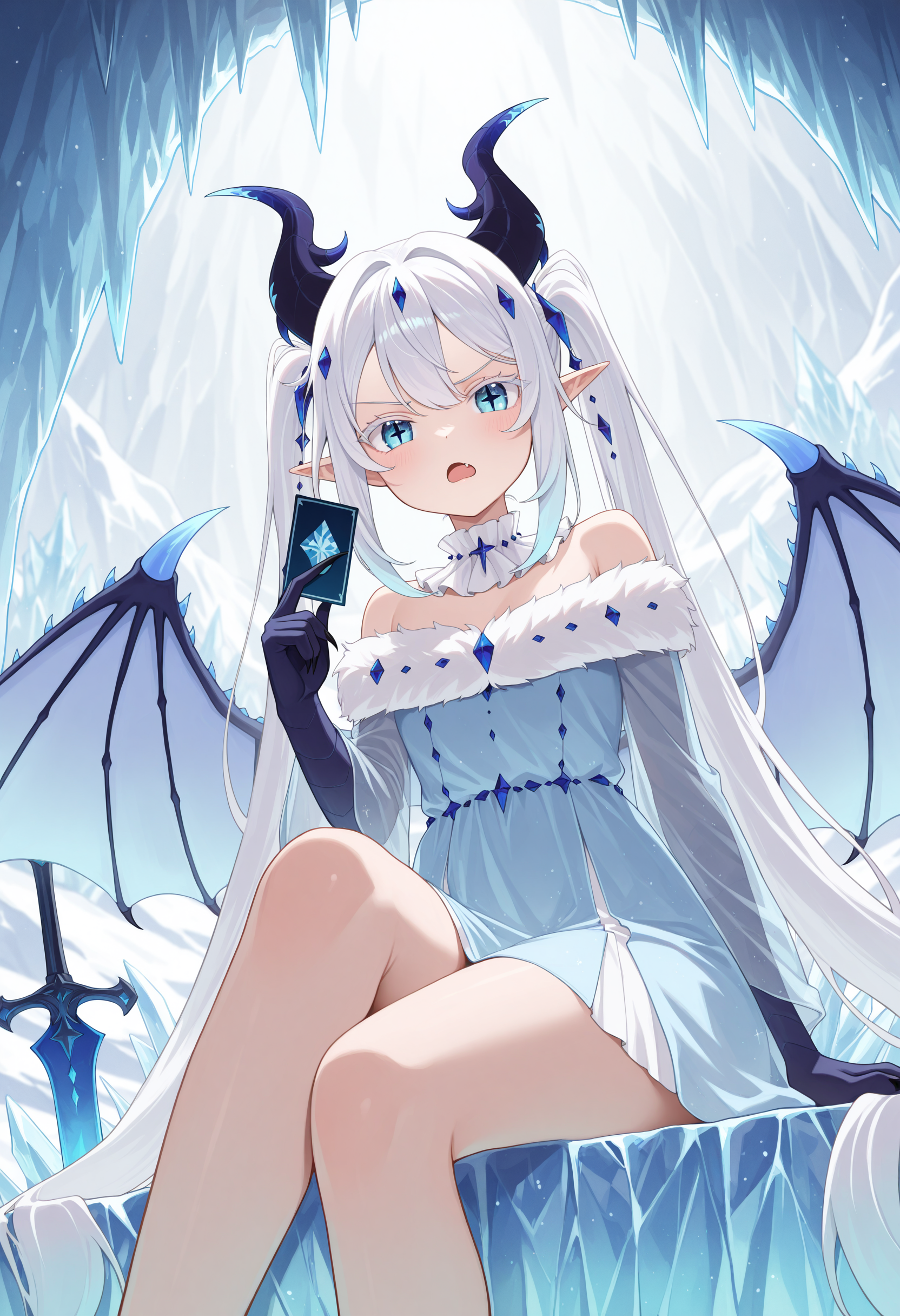 她有着长长的白色双马尾头发,蓝色眼睛,瞳孔为黑色菱形,头发中镶嵌着珠宝,还有深蓝色的角。