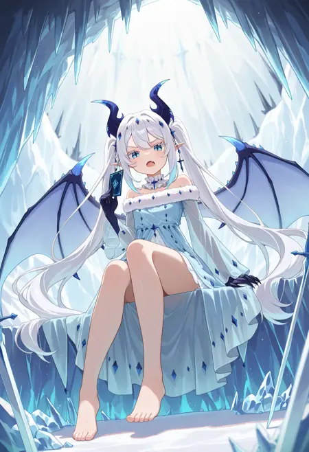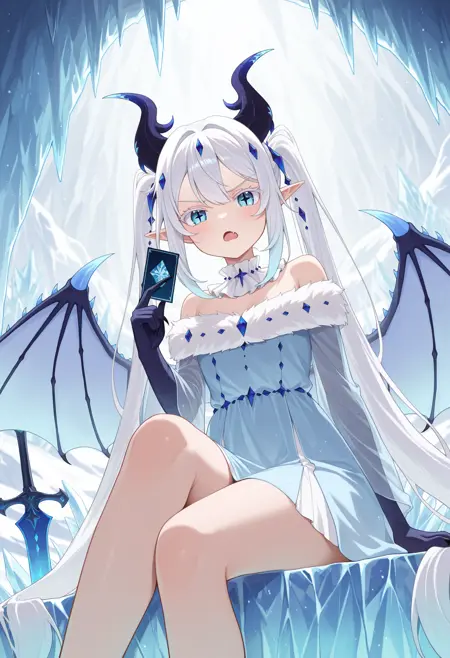 彼女は長い白いツインテールの髪を持ち、瞳は青色で、黒いダイヤモンド型の瞳孔を持ち、髪には宝石が散りばめられており、濃い青色の角もある。
