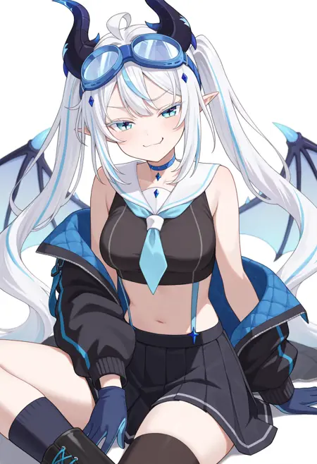 She has long white twintailed hair with blue eyes with black diamond shaped pupils and jewels through out her hair as well as dark blue horns.