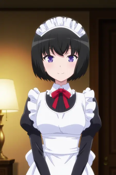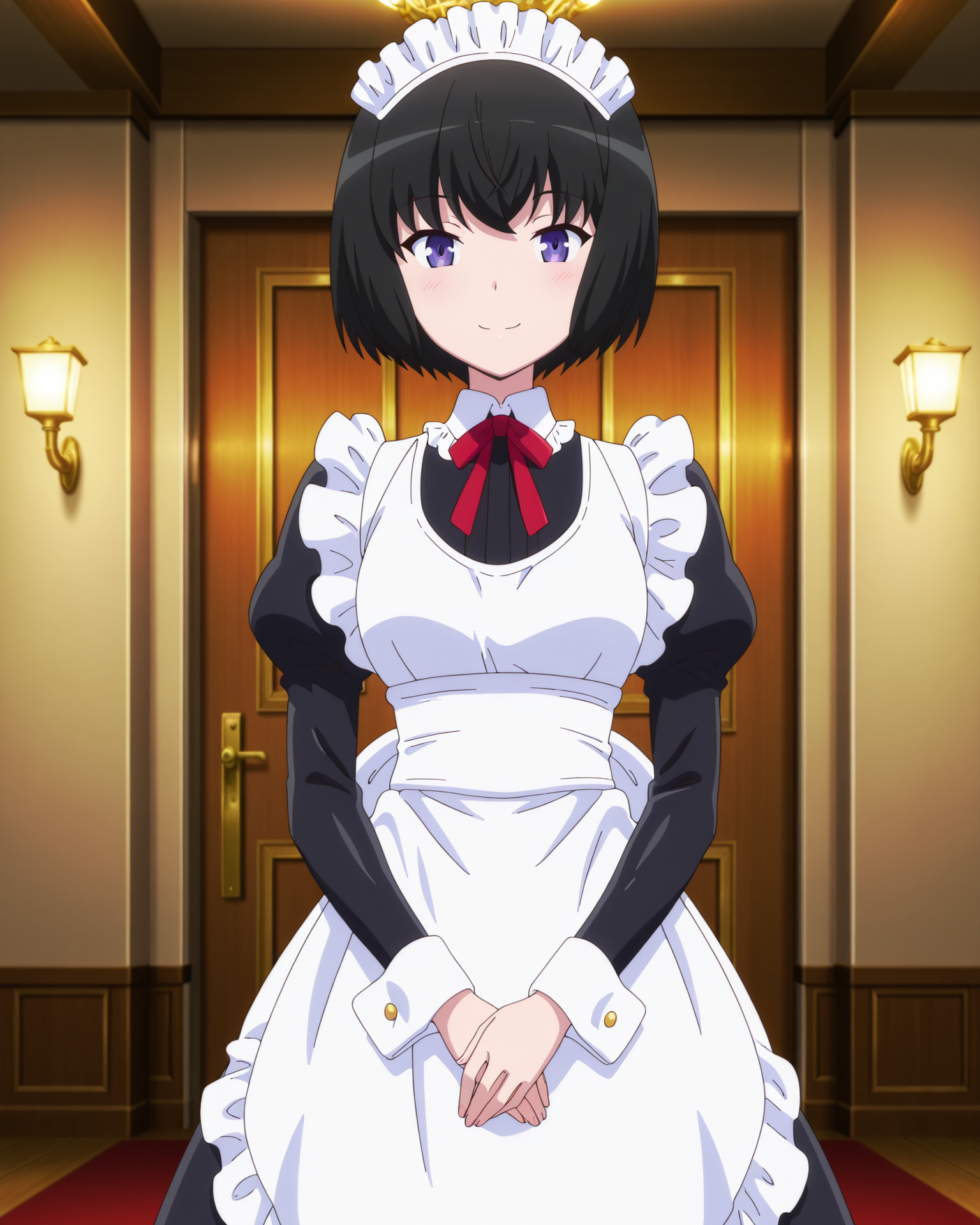 — 一位安静而自律的女仆,眼神锐利,专注力坚定。她的黑色波波头、紫色眼睛和经典制服体现了她严肃的个性。她冷静高效,每项任务都以精确而低调的方式完成,极少表露情绪,但始终可靠。