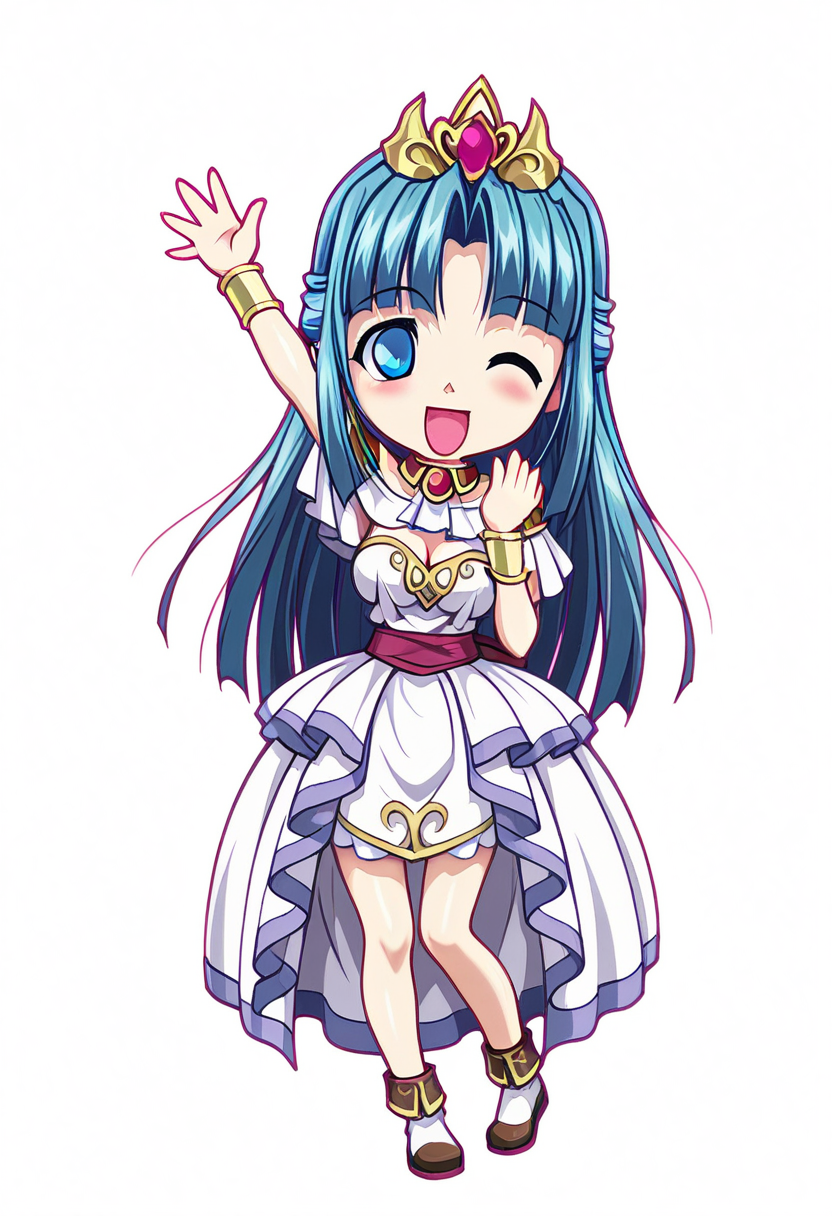 옷: 흰 드레스, 가슴 노출, 팔찌, 왕관
