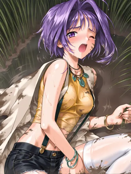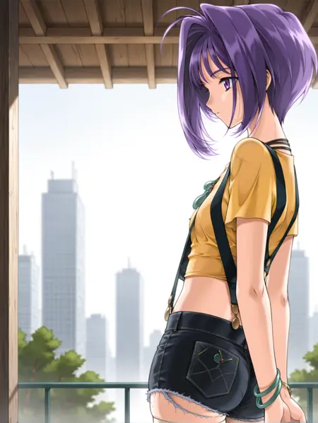 衣装ワード ・k_clothes,sleeveless white coat,jewelry,necklace,yellow shirt,midriff,suspenders,bracelet,shorts,cutoffs denim shorts,white_thighhighs,