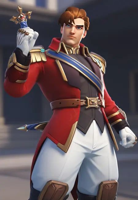 - To generate his Royal Swordsman - genji \(royal swordsman\) \(overwatch\), short hair, brown hair, side bangs, ducktail, blue eyes, black shirt, epaulette, red jacket, white pant, uniform, gauntlet, white gloves, boots