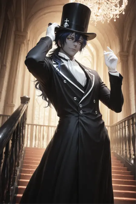 ✨ 1시즌 티키 버전: Tyki Mikk, D.Gray-man, 애니메이션, 남성, 검은 회색 피부(또는 창백한 피부), 이마의 십자 무늬, 곡선으로 정돈된 검은 머리, 황금색 눈, 흰색 주름 넥타이가 달린 검은 정장, 라펠이 있는 검은 코트, 흰 장갑, 검은 고모자, 지팡이