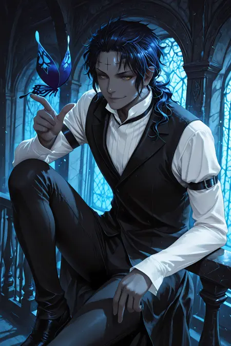 ✨ 2시즌 티키 버전: Tyki Mikk, D.Gray-man, 애니메이션, 남성, 검은 피부, 긴 어지러운 검은 머리, 느슨한 단발, 팔에 검은 문신, 하얀 오픈 셔츠, 검은 타이트한 바지, 자신감 있는 표정, 검은 나비, 보라색 나비, 이마의 십자 무늬,