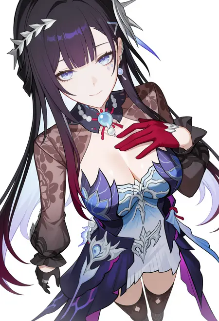 这次的lora是《崩铁》的角色-海瑟音,v1.1版本。本次lora使用了3D模型进行训练,角色还原度有很大提升,同时解决了1.0画风过拟合、头饰颜色不准确的问题,同时此模型可以生成出透明腹部的效果(透过腹部看到肋骨)此版本暂定为最终版本,如果有更好的训练集,会再训练集一个版本。此lora仅用触发词就可以还原人物外观特征,但是可能会被和色彩相关的tag影响,所以可以考虑添加以下tag来保证人物的还原度: