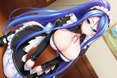 maid, maid headdress, ponytail, shoes, dress, mary janes, cleavage
