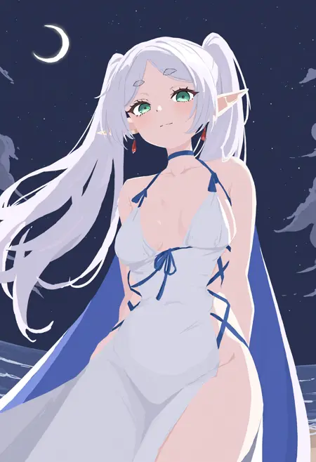 positive_prompts = "(masterpiece, extremely aesthetic, best quality, amazing quality), newest, highres, absurdres, cowboy shot, from side, sleepy, 1girl, elf, frieren, long hair, white hair, twintails, black hair spikes, pointy ears, crystal earrings, red gemstone, parted bangs, thick eyebrows, half-closed eyes, green eyes, blush, open mouth, parted lips, bare shoulder, collarbone, white evening gown, blue cross-laced slit, hand up, open hand, yawning, squeans, blue-white cape, white background"