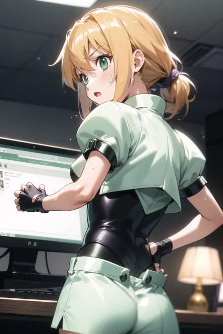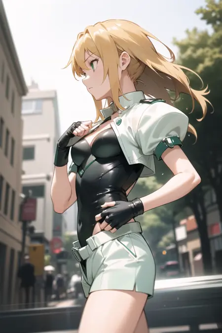 excel, fingerless gloves, puffy short sleeves, leotard, short shorts
