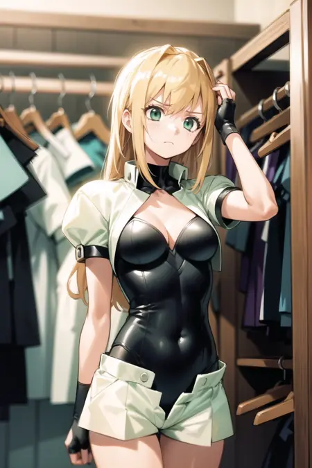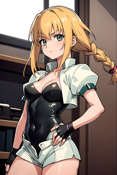 outfit: cleavage, fingerless gloves, puffy short sleeves, shorts, black leotard