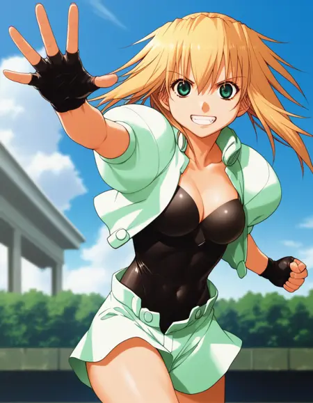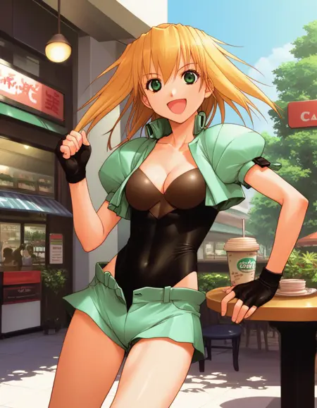 outfit: cleavage, fingerless gloves, puffy short sleeves, shorts, black leotard