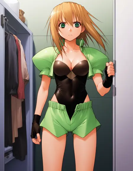 excel, fingerless gloves, puffy short sleeves, leotard, short shorts