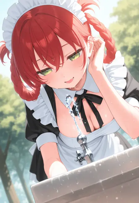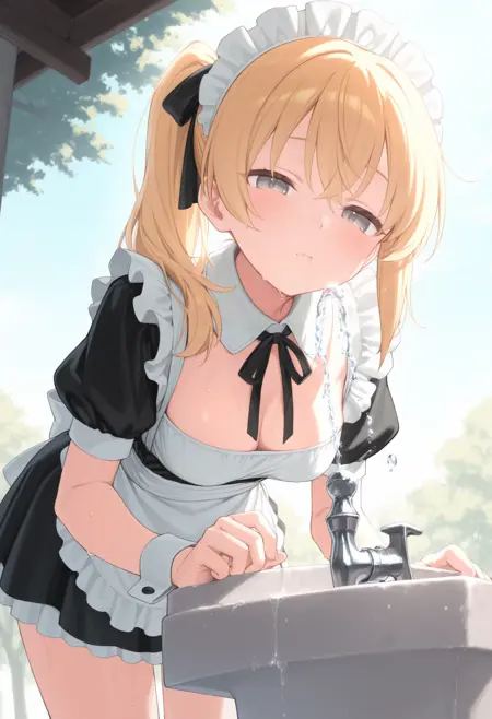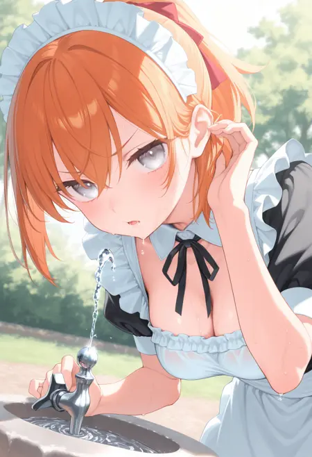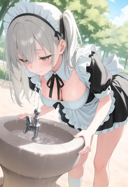 トリガーのみでも水道から水は出ますが、人物が立ち姿になるため、「fountain」「faucet」「leaning forward」「drinking」「water」「bent over」「water drop」「wet」「wet face」「faucet」などの単語からお好みのものを追加してください。