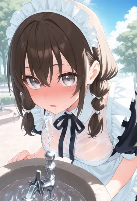 仅使用触发词时,水龙头也会出水,但人物会站得笔直,因此请从以下词汇中选择您喜欢的词添加:fountain(饮水机)、faucet(水龙头)、leaning forward(身体前倾)、drinking(饮水)、water(水)、bent over(弯腰)、water drop(水滴)、wet(湿透)、wet face(湿脸)、faucet(水龙头)。