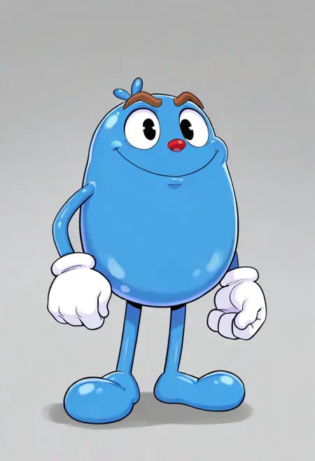 GoopyLeGrande, 1boy, round blue glossy body, large expressive black eyes, small red nose, white gloves, brown eyebrows, slimeball